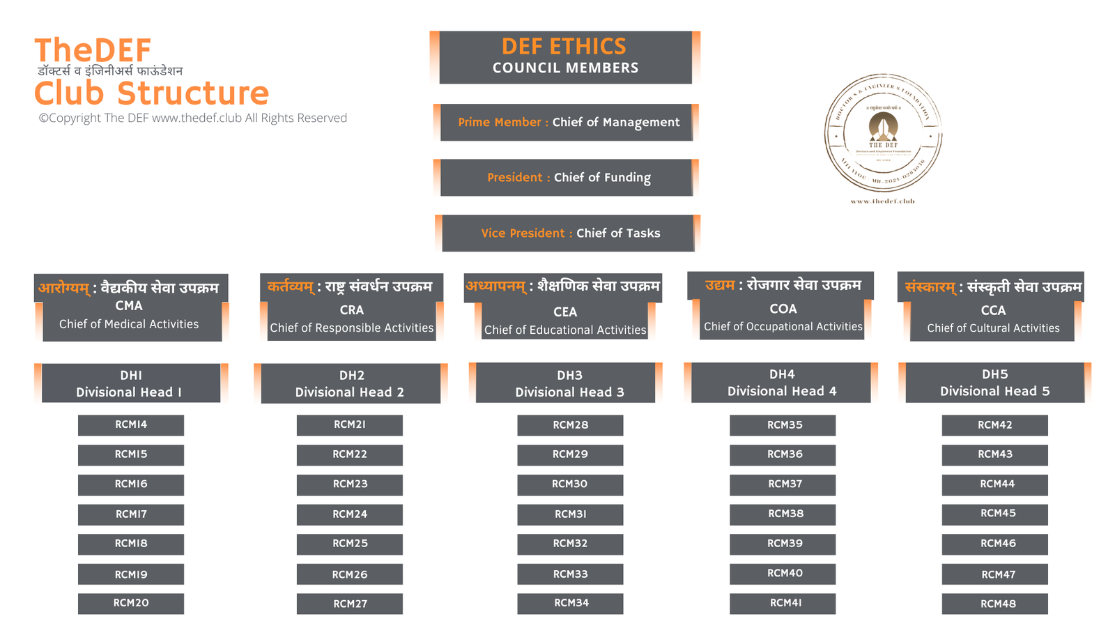 The DEF’s Taluka-level executive committee, known as the CLUB, consists of 48 members. This includes 8 Committee Members (Prime Member, President, Vice-President, CMA, CRA, CEA, COA, CCA) and 5 main divisions, each with 8 representatives. All members are local residents from the same Taluka.